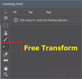 Vanishing Point 작업창 자체에도 좌측에 Free Transform 툴이 있어 어느 정도는 수동으로 각도, 크기 등을 조정한 뒤에 소실점 구역 안으로 넣어 줄 수 있습니다.
