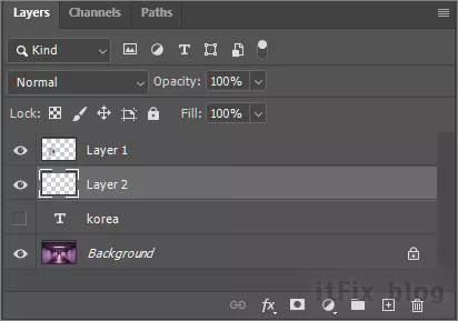 Korea라고 적어 넣은 다음 폰트와 크기를 정하고 이 역시 , Ctrl+A, Ctrl+C 한 다음 빈 곳을 마우스로 찍어 선택을 해제했습니다. 이제 최초로 생성된 텍스트 레이어는 눈 표시를 눌러보기를 꺼준 다음 빈 투명 레이어를 생성해 줍니다.