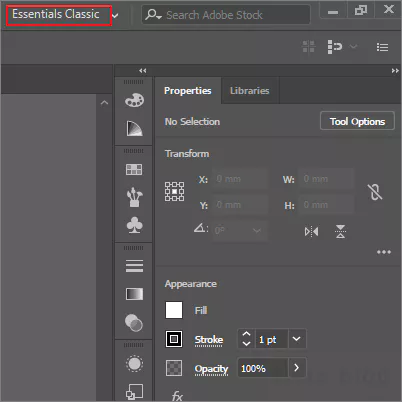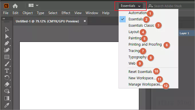 일러스트레이터의 경우에는 그 사용 목적에 따라 다양한 종류의 작업 화면 및 상단 메뉴, 패널로 변경이 가능하며, 이러한 변경은 툴 상단의 Essentials라는 메뉴를 클릭하여 선택하면 됩니다. 기본 형태는 Essentials입니다.