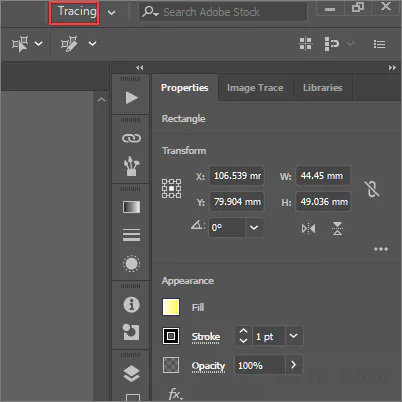 비트맵 이미지를 변형하기 편리한 화면으로 구성됩니다. 패널에 Image Trace 탭이 보입니다.