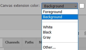 포토샵의 캔버스 사이즈는 기본적으로 백그라운드 색상이 늘어나는 영역에 채워지게 됩니다. 이 옵션은 캔버스 사이즈 조절 창에 전경 색, 배경색 또는 기타 사용자가 원하는 색상으로 캔버스가 채워지게 옵션을 줄 수 있습니다.