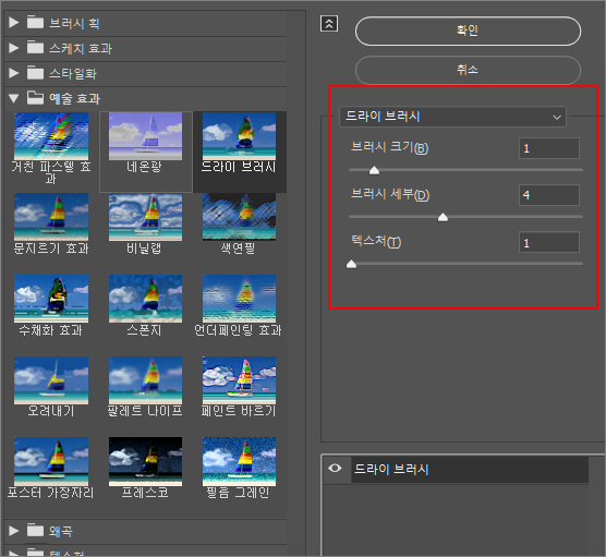 4. 필터 갤러리 > 예술 효과 > 드라이 브러시를 선택합니다.