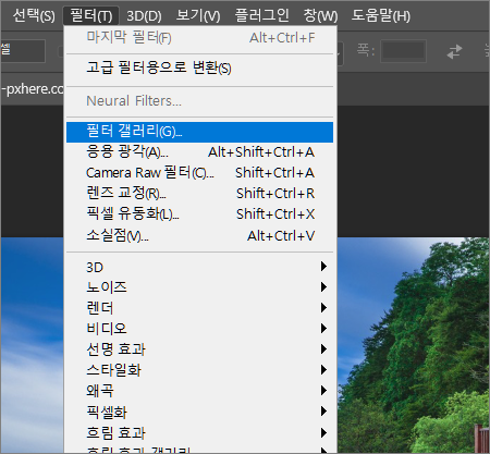 3. 상단 메뉴의 필터 > 필터 갤러리를 클릭하여 필터 갤러리를 불러옵니다.