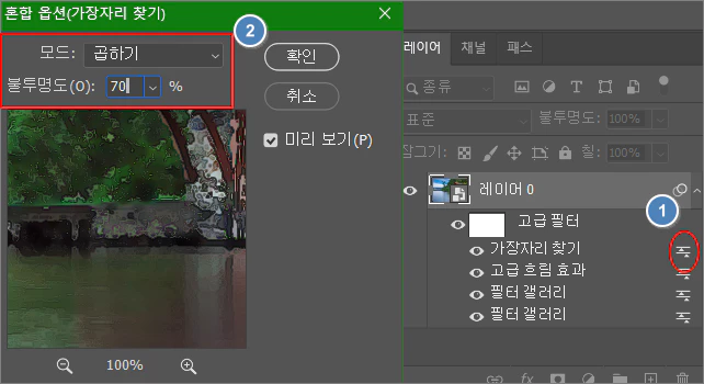 10. 하부 레이어 목록중 가장 위에 있는 가장자리 찾기 레이어 우측을 더블 클릭해 혼합 옵션 창을 연 다음 곱하기 모드로 변경하고 적당한 불투명도 값을 적용해 줍니다.