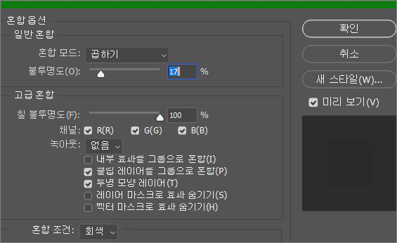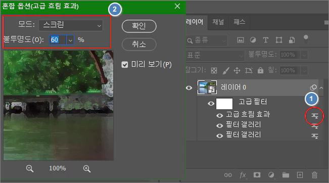 8. 고급 흐림 효과 하부 레이어 우측을 더블 클릭해 혼합 모드 옵션 창을 열고 스크린 모드를 선택해 주고 불투명도를 적당히 조절해 너무 밝지 않도록 해 줍니다. 조절이 끝나면 확인을 눌러 적용해 줍니다.