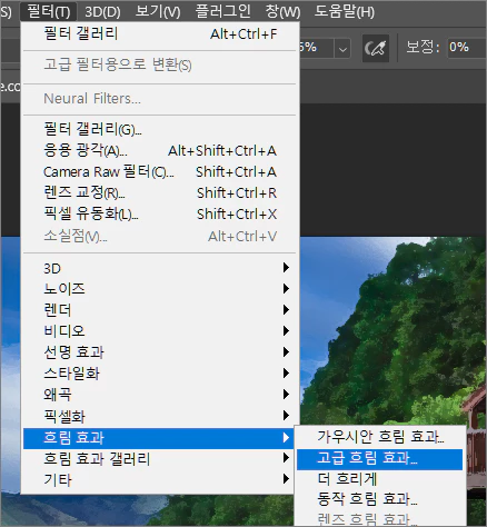 7. 상단 메뉴의 필터 > 흐림 효과 > 고급 흐림 효과(Smart Blur)를 클릭한 다음 확인을 눌러 적용시켜 줍니다.