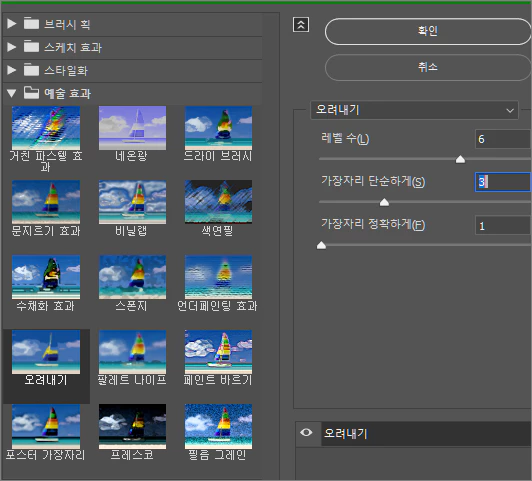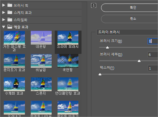 3. 예술 표과 > 드라이 브러쉬를 선택하고 기본 수치 또는 이미지에 적합한 적당한 수치를 입력합니다.