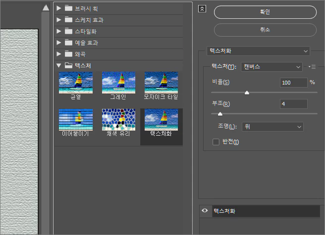 12. 방금 추가한 레이어가 선택된 상태에서 상단 메뉴의 필터 > 필터 갤러리 > 텍스처 > 텍스처화 옵션을 선택하고 적용해 줍니다.