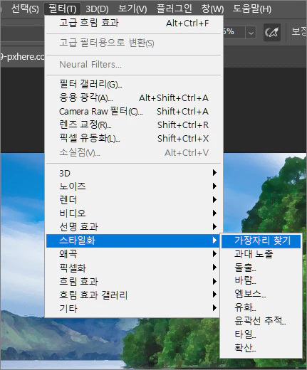 9. 상단 메뉴의 필터 > 스타일화 > 가장자리 찾기를 클릭하면 별도의 설정 팝업 없이 바로 적용되고 하부 레이어가 생성됩니다.