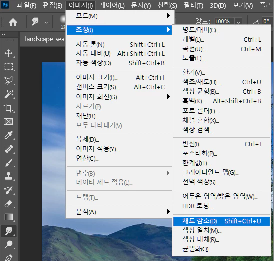 상단 메뉴에서 이미지 > 조정 > 채도 감소를 클릭해 줍니다.