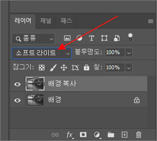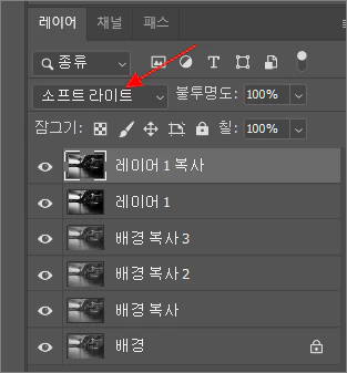 이러한 질감을 없애기 위해 복제된 레이어가 선택된 상태에서 혼합 옵션을 소프트 라이트로 변경해 줍니다.