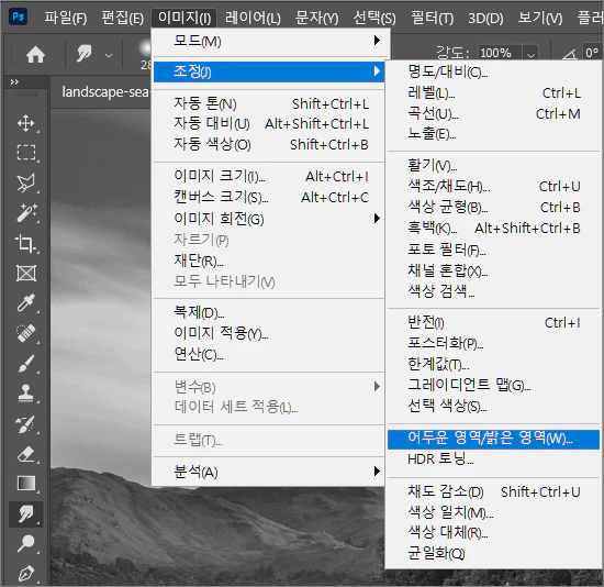 이렇게 하면 컬러 이미지가 흑백으로 변경되는데, 만일 너무 경계가 모호한 검은 부분들이 보인다면 상단 메뉴에서 이미지 > 조정 > 어두운 영역/밝은 영역(Shadow & Highlights)을 클릭해 기본값을 적용해 줍니다. 이 기능은 역광 이미지를 보정할 경우에 주로 사용하는 기능으로 어두운 부분의 형체가 분명하지 않을 경우에 이 옵션을 적용하면 좀 더 명확하게 보이는 기능을 합니다.