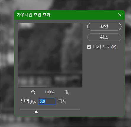 가우시안 옵션 창에서 반경 값은 5픽셀 정도로 지정해 줍니다. 이미지에 맞게 적당한 값을 지정할 수 있습니다.