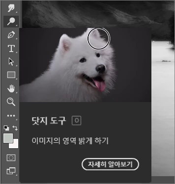 왼쪽 툴바에서 닷지 도구를 선택한 다음 상단 브러시 옵션에서 부드러운 원(소프트 라운디드) 브러시를 선택합니다.