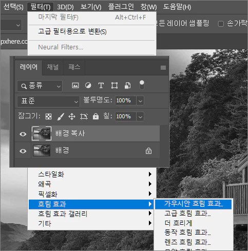 이제 복제된 레이어가 선택된 상태에서 상단 메뉴 중 필터 > 흐림 효과 > 가우시안 흐림 효과를 클릭해 줍니다.