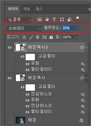 18. 레이어 창의 레이어 혼합 모드 설정 창을 클릭하여 오버레이, 불투명도 25%로 변경해 줍니다.