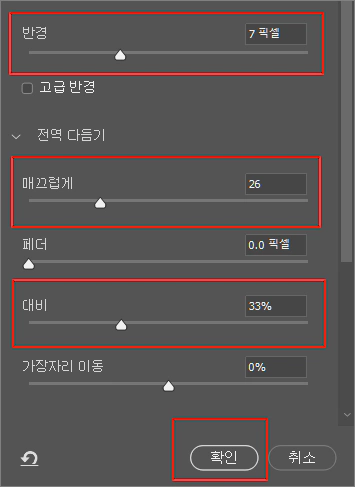 7. 반경, 매끄럽게, 대비 옵션을 적당히 늘려 주도록 한 다음 확인 버튼을 눌러 줍니다.