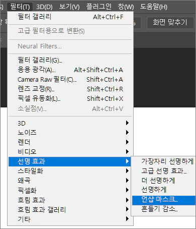 12. 상단 메뉴에서 필터 > 선명 효과 > 언샵 마스크를 클릭합니다.