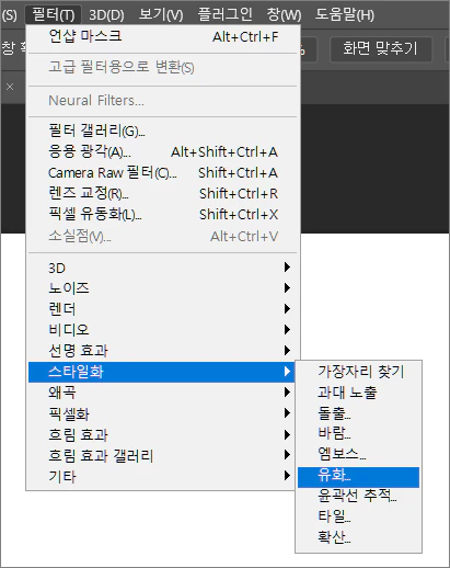 13. 상단 메뉴에서 필터 > 스타일화 > 유화 필터를 선택합니다.