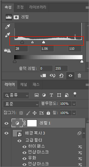 레벨 레이어 위쪽의 레벨 속성 창 그래프 아래의 삼각형을 움직여 적당한 수치로 조절해 줍니다.