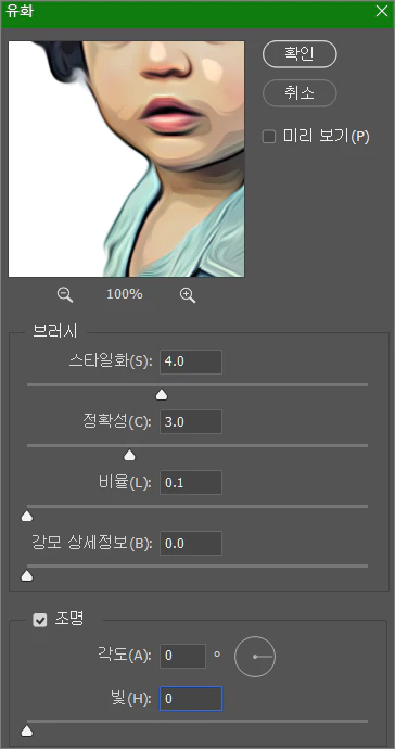 이 필터는 Oil Filter로 불리던 것으로 버전에 따라서는 스타일화 범주에 위치하지 않고 픽셀 유동화, 렌즈 교정 등의 필터와 함께 나와 있는 경우도 있습니다.