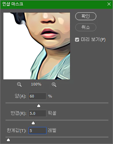 언샵 마스크 옵션 창에서 양(A)을 90%, 반경(R)을 5.0 픽셀, 한계값(T)을 10 레벨로 지정해 주고 확인 버튼을 눌러 줍니다.