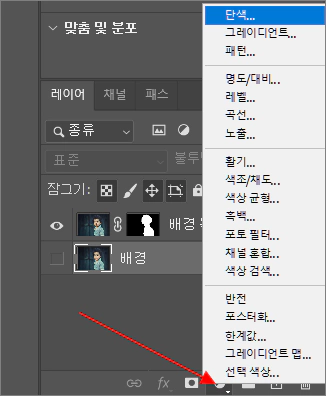 8. 배경 레이어의 눈표시를 눌러 끈 다음, 배경 레이어가 선택된 상태에서 아래쪽의 새 레이어 아이콘을 눌러 단색 레이어를 만들어 줍니다. 단색 레이어의 색상은 흰색으로 만들었습니다.