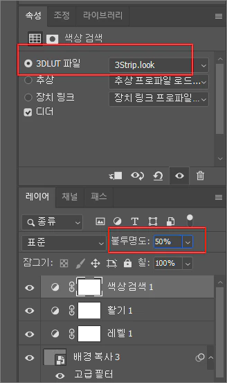 색상검색 레이어의 옵션을 3Strip.look으로 변경하고 불투명도는 50%로 지정해 줍니다.