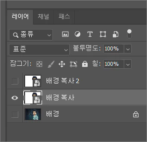 15. 이번에는 현재까지 작업했던 레이어의 위에 있는 배경 복사 2 레이어를 선택해 주고, 눈 아이콘을 눌러 보이도록 해 줍니다.