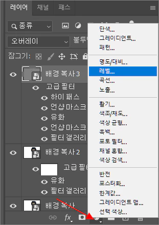 21. 레이어창 하단의 조정 레이어 아이콘을 클릭하고 레벨을 선택해 줍니다.