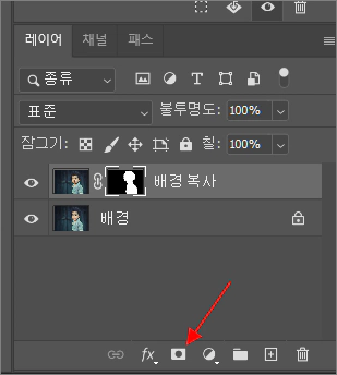 4. 경계선이 대략 완성되었다면 복제 레이어가 선택된 상태에서 아래쪽의 레이어 마스크 아이콘을 클릭해 레이어 마스크를 만들어 줍니다.
