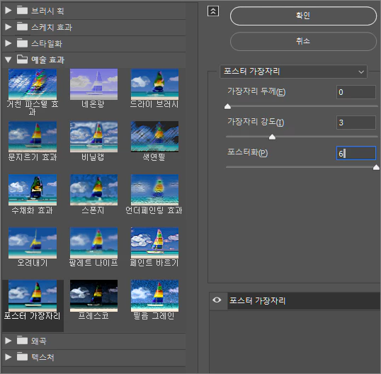 16. 상단 메뉴에서 필터 > 필터 갤러리 > 예술 효과 > 포스터 가장자리를 선택하고 옵션은 0, 3, 6을 지정해 주고 확인을 눌러 줍니다.