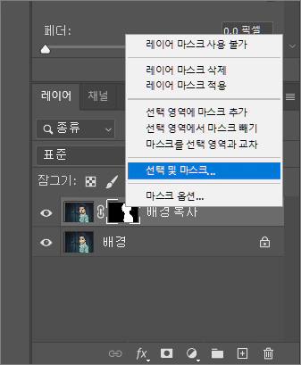 5. 레이어 마스크를 우클릭하고 선택 및 마스크(refine mask)를 클릭합니다.