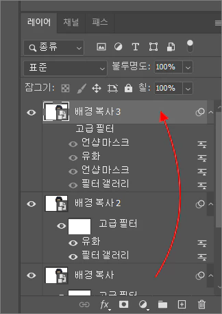 19. 배경 복사 레이어를 복제한 다음 가장 위로 올리고, 고급 필터 효과는 끄도록 합니다.
