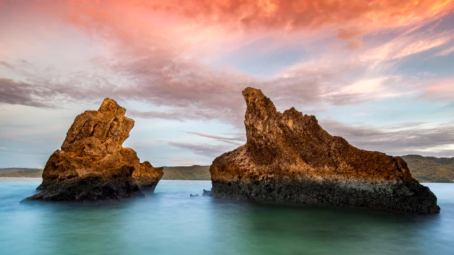 도미니카 공화국의 사마나 베이(Samaná Bay) 인근 카요 레반타도 섬에 있는 두 개의 바위와 일출 모습입니다.