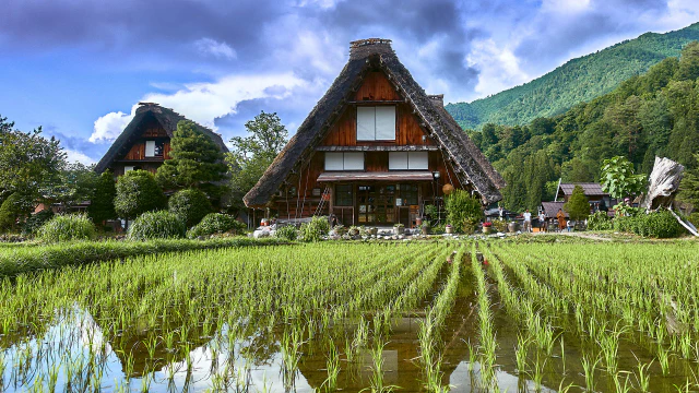 일본 기후현 북서부의 시라카와 마을의 전통 가옥과 논의 모습입니다.