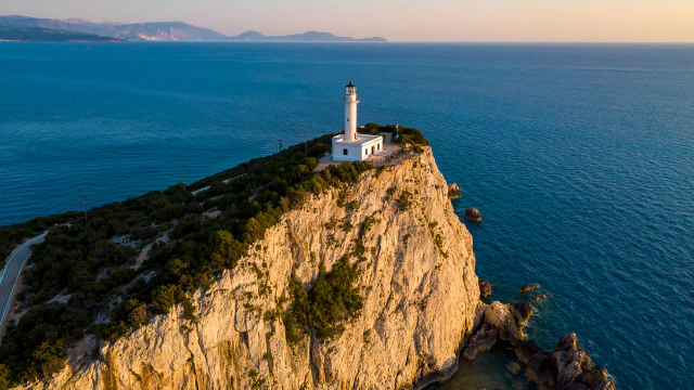 그리스 서부 해안에 있는 섬인 레프카다 섬의 등대를 공중에서 촬영한 사진입니다.