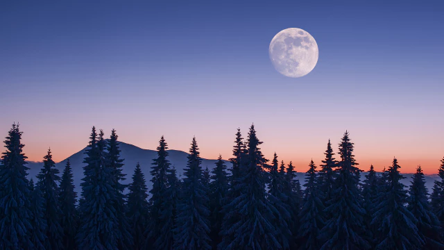 전나무 숲 위쪽으로 떠있는 달을 여명을 배경으로 낮에 촬영한 사진입니다.
