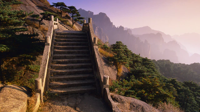 중국 안후이성 황산시에 있는 계단의 모습입니다. 황산은 1990년 유네스코 세계 문화유산으로 지정되었습니다.