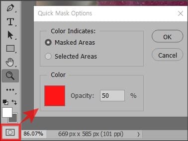 하단 왼쪽의 퀵마스크 모드를 더블 클릭하면 Quick Mask Option 창이 뜨게 됩니다. 여기서 선택영역 바깥쪽을 마스크로 지정하려면 Masked Areas를, 선택영역의 내부를 지정하려면 Selected Areas를 선택하면 됩니다. 다만, 활용도 면에서는 Selected Areas가 좀더 활용도가 높으므로 기본값을 변경하여 Selected Areas로 바꿔주는 것이 좋습니다.
