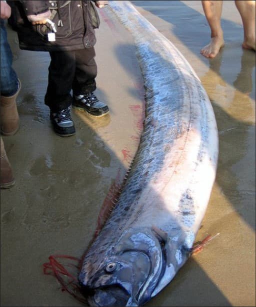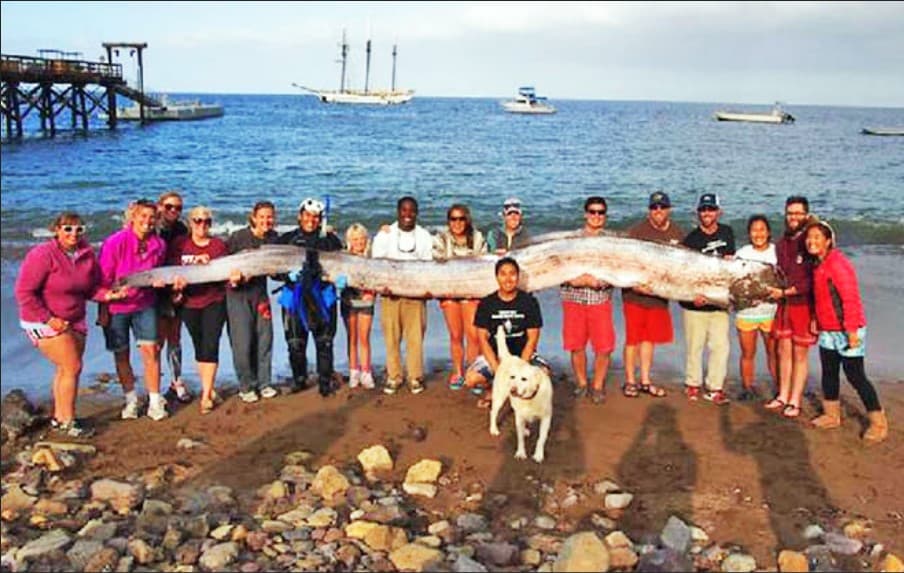 아래의 사진은 2013년 미국 캘리포니아 카탈리나 제도의 한 섬에서 사체로 발견된 17미터 길이의 심해 갈치의 모습입니다.