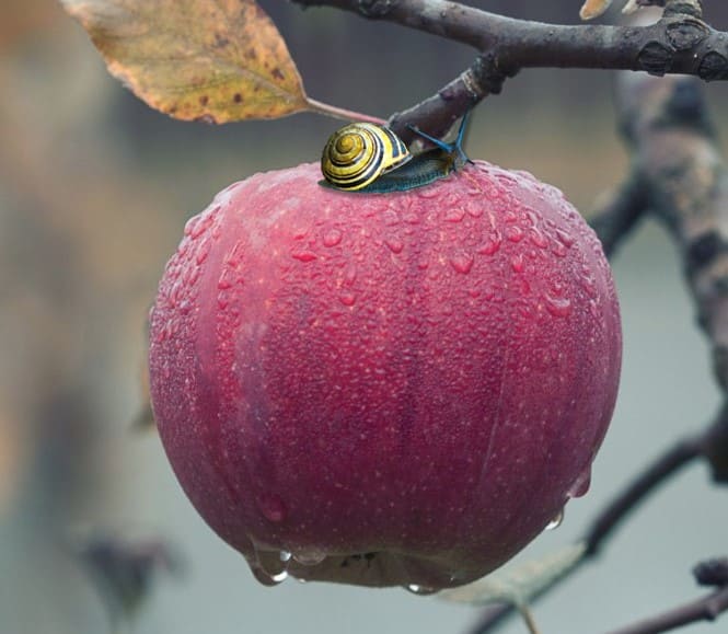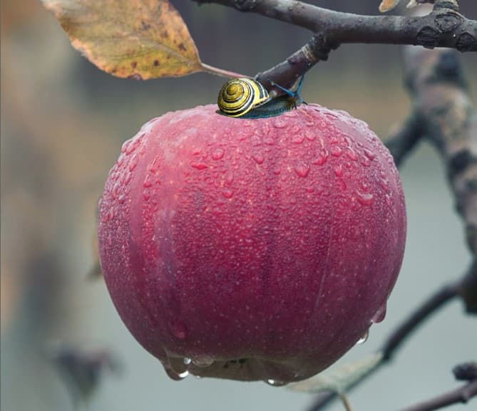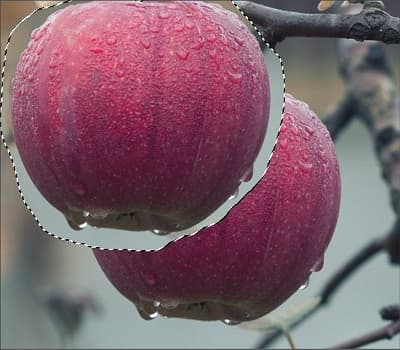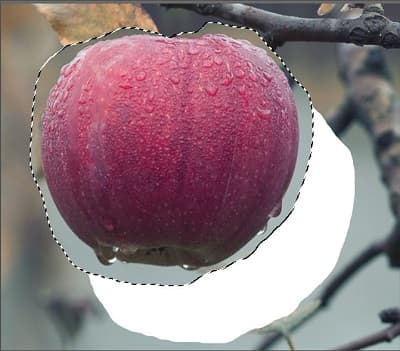 올가미 툴(Lasso)을 이용해 사과의 테두리를 선택한 다음 이동 툴을 클릭하면 커서 아이콘에 가위 모양이 표시됩니다. 올가미 툴에 의해 선택된 부분을 이동 툴을 사용해 이동시키면 이동한 자리에는 포토샵에서 설정한 배경 색상으로 채워지게 됩니다.