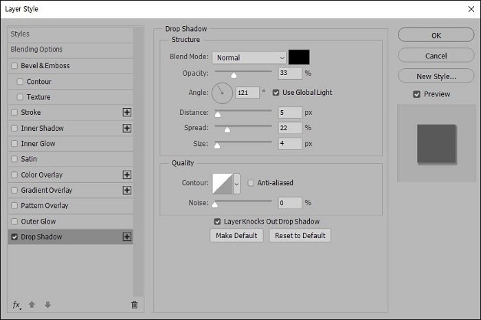아래쪽의 드롭 쉐도우 옵션을 선택한 다음 미리 보기를 하면서 적당한 그림자를 만들어 줍니다. 이후 저장한 약한 그림자가 들어간 합성 이미지의 모습은 아래와 같습니다. 그림자 효과가 약하게 들어가서 언뜻 구분은 잘 안됩니다.