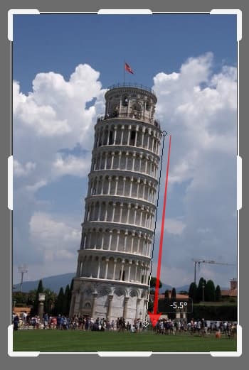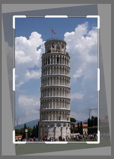 포토샵에서 피사의 사탑 이미지를 불러온 다음 좌측의 도구 모음에서 자르기 도구를 선택합니다. 그다음 상단에 있는 Straighten 툴을 클릭하고 마우스 포인터가 바뀌면 세워줄 부분의 외곽을 따라 선을 긋습니다.