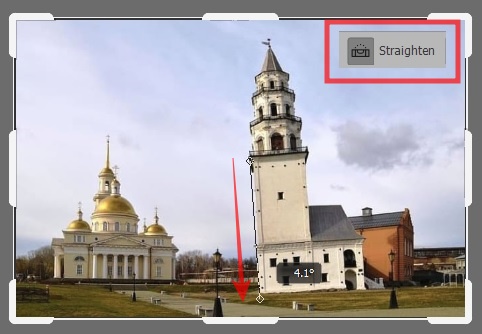 이 러시아의 탑도 바로 세워주기 위해서 위에서와 마찬가지로 도구 툴에서 자르기 툴(Crop Tool)을 선택한 다음 상단 메뉴에서 Straighten 툴을 클릭해 커서 모양이 바뀌면 드래그하여 줄을 그어 줍니다.