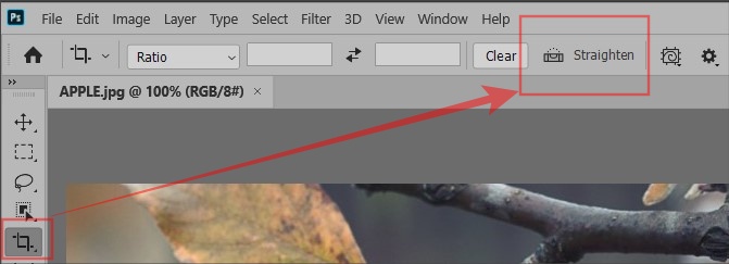 포토샵의 기울어진 오브젝트의 바로 세우기 전문 툴은 자르기 도구 툴을 선택했을 때 상단에 나오는 Straighten 툴을 사용합니다.