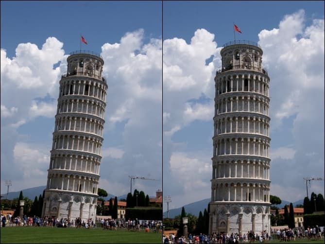 이 상태에서 영역의 가운데 부분을 더블 클릭하면 피사의 사탑 바로 세우기 작업이 끝이 납니다. 아래의 사진은 기울어진 피사의 사탑을 보정한 사진과 비교한 이미지입니다.