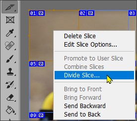 이미지를 불러 온 다음 슬라이스 툴을 선택하고 이미지에서 마우스 우클릭하여 Divide Slice(분할 영역 나누기)를 선택합니다.