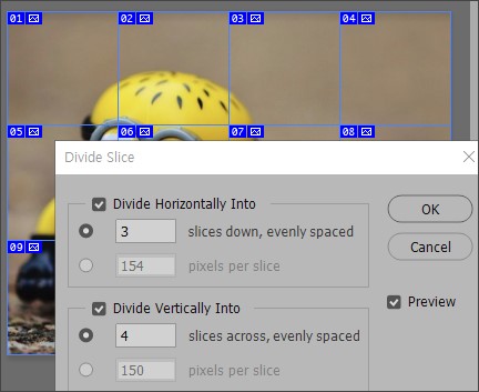 그러면, 아래와 같은 슬라이스 옵션 대화 상자가 뜨게 됩니다. 대화 상자에서 예를 들면 수평 방향으로는 3구역으로 균일하게 나누고, 수직 방향으로는 4구역으로 나누는 옵션을 설정하려면 숫자를 3과 4를 각각 넣어 주면 됩니다. 미리 보기가 되므로 보면서 설정하면 쉽습니다.
