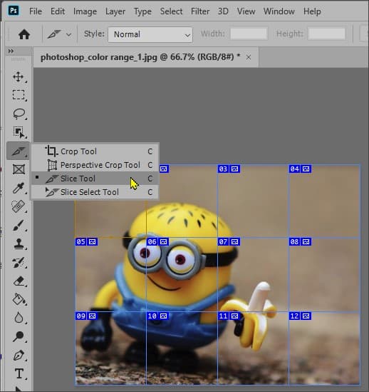 여러 개로 자르는 기능은 Slice Tool(분할 영역 도구)을 선택한 다음 작업을 하게 되면, 바로 아래의 Slice Select Tool(분할 영역 선택 도구)은 각각의 잘라진 조각을 선택하는 용도로 사용하는 툴로 직접 편집 작업에 관여하는 툴은 아닙니다.